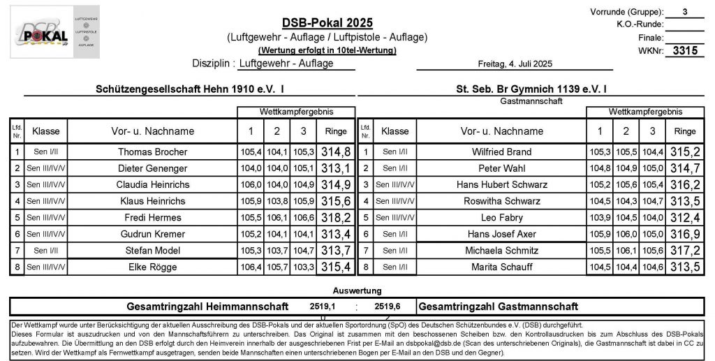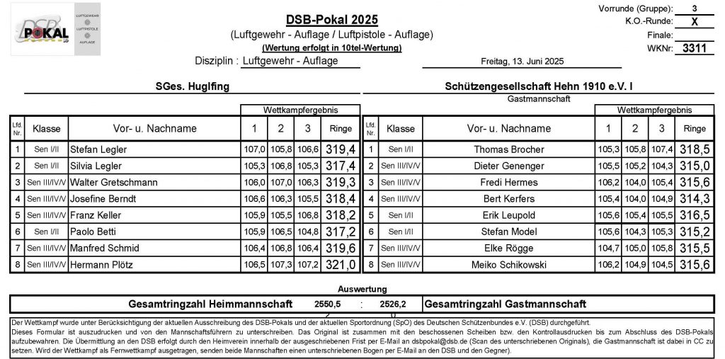 In der Disziplin Luftgewehr – Auflage qualifizieren sich die jeweils zwei Erstplatzierten Mannschaften der 4 Gruppen für das DSB-Pokal-Finale. Das DSB-Pokal-Finale 2025 wird am Freitag, den 19.September 2025 auf dem Schießstand der ZSG Bavaria Unsernherrn e.V. gegr. 1893, Münchener Straße 261 , 85051 Ingolstadt ausgetragen.