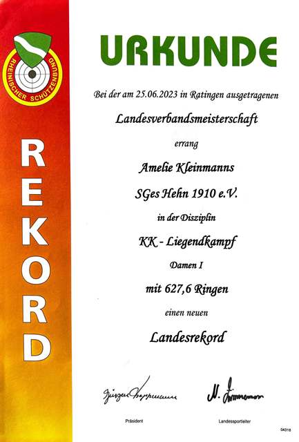 Landesrekord bei den Landesverbandsmeisterschaften in der Disziplin KK-Liegendkampf, Einzelwertung Damen I, durch Amelie Kleinmanns
